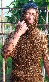 渐渐地,吴礼如的脖子、耳部等部位聚拢了一大批蜜蜂。这时候的他臃肿了将近一圈。