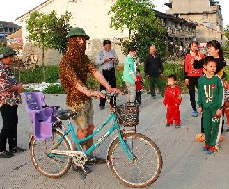 这些还不是吴礼如的绝活,10分钟后,他穿着“蜂衣”跨上一辆自行车,骑着车在村子里慢慢转悠,身上的蜜蜂也乖乖的,像是完全被驯服了的宠物。