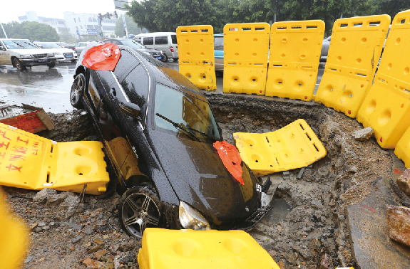 昨天上午10时,记者赶到事发地点看到,出事的是一辆黑色豪车,大部分已掉入坑里,只剩车辆右后轮留在路面上。这个坑四周布满黄色隔离设施,长约3米、宽约2米、深约1.5米,坑中间有一个井盖。车辆掉在坑里,进退不得。车辆前保险杆和车灯有损坏,底盘有刮擦。
