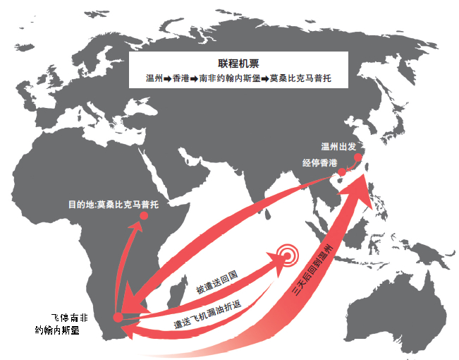 温州市民林女士本月初经历了一趟现实版的“人在囧途”:订了温州—香港—南非约翰内斯堡—莫桑比克马普托的联程机票,结果跑了大半个地球到了中转站南非约翰内斯堡,却被遣送回国。