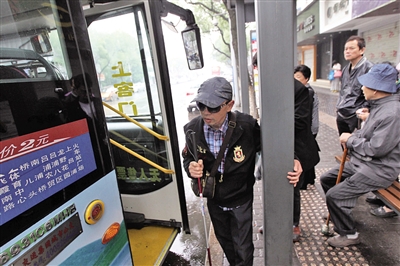 一路上,郑百芳一直专注于报站的声音,生怕错过站。他说,每次坐公交车到不太熟悉的地方,心里会很没底。听到下一站便是目的地,郑百芳早早起身,在盲杖的帮助下摇摇晃晃候在车门前。