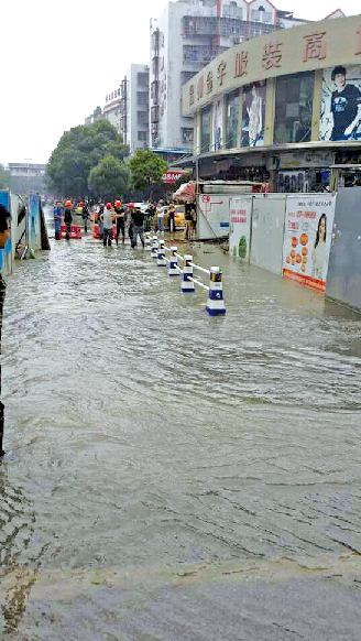 昨天上午10时许,有网友发微博称“火车站这里有个露天游泳池”。微博照片中,火车站西侧金宇商务楼前的路面已经满水,往来行人蹚水过路,摩托车开过溅起一片水花。下午4时许,记者赶到现场后发现路面积水已退。金宇商务楼一楼一鞋店老板介绍,当天上午,该处都都是水,人都过不去,大约过了一个小时,水才退下去。