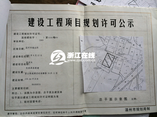 “我这个是少批多建。”黄老伯从楼上走下来,手里拿着一堆文件。他告诉记者,自己家原来有一座两层的房屋,2009年被鉴定为危房后,经过“原拆原建”审批,重新建起这座新房。在建房过程中,确实多建了一部分。根据一份盖有温州市国土资源局瓯海分局南白象管理所公章的文件,黄老伯向政府部门申请修建占地面积169.83㎡,建筑面积339.66平米的房屋。