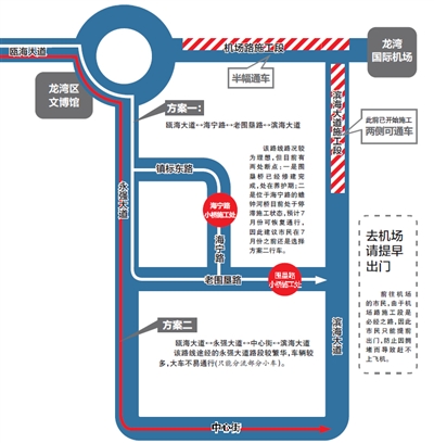 机场口枢纽工程预计2017年底完工,也就是双向四车道通行的情况可能会持续到2017年底。目前,施工方中交一公司项目部已开通“龙湾机场口枢纽”微信公众号,届时若遭遇拥堵,市民可通过微信留言联系施工方设置临时通道通行。(林敏 秦泓)
