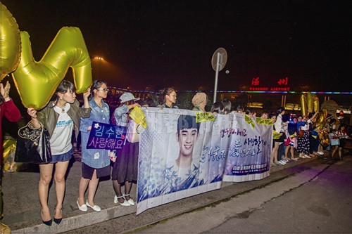 昨晚6时许,记者来到温州龙湾国际机场,看到在国际/港澳台到达出口已经聚集了50多名粉丝。他们拉着横幅,喊着“金秀贤,我爱你”等口号,都在等待来自星星的他——“都教授”金秀贤的到来。