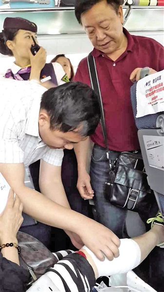 车上另外两位医生乘客也很快赶到,大家一起合作动手,为这名受伤乘客清理了伤口,并做了包扎。