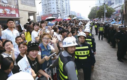 金秀贤的露面总共持续不到10分钟,但仍引来粉丝阵阵尖叫。粗略计算,围观人群多达四五百人,但真正的粉丝,多是挤在最里层的小姑娘。她们中的很多人是从全国各地赶来的,前晚去龙湾国际机场接机落空后,她们希望见上偶像一面。