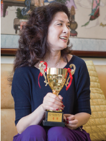 黄女士称是第一次参加这样的大型比赛。报名时想不到能获奖,所以也没有思想负担。全国总决赛结束后,她就拿着奖杯卸妆回宾馆了,直到主办方通知她回去合影,她才想起还有这个规定的程序,又匆匆赶回去。
