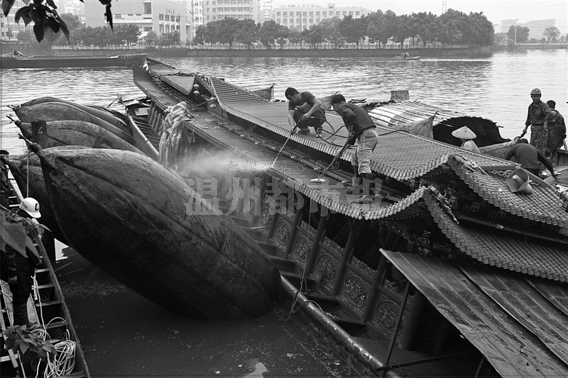 据介绍,根据之前的初步方案,水上台阁沉没后,将采用吊车起吊。最后没有采用这个方案,是因为台阁沉入水里的时间较长,台阁里面的淤泥多,贸然用吊车起吊,很可能导致台阁整体散架。为了防止这一情况的发生,决定还是用去年的气囊打捞方法。