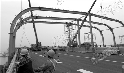 “全封闭隔声屏障建设完毕后,就好像在桥上搭起了一段空中隧道,将大桥与外界隔离。”昨天下午,记者来到瓯江过江通道江南岸施工工地,看到与香榭丽花园小区相近的桥面上已架起了三榀梁柱。据隔声屏障施工单位相关负责人介绍,他们上周五正式进场施工搭建隔声屏障主体结构。