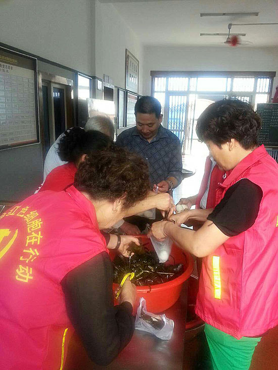 爱心食堂阿姨们身披红色志愿小马褂忙碌着卷粽叶、填糯米、绑红绳,煮鸡蛋,相互帮忙互相协作,洋溢着节日的气氛和欢快的笑声。到了中午,村里的老人陆续来就餐时,阿姨们递上热腾腾刚出炉的粽子跟鸡蛋,而老人们乐呵呵地坐在一旁品尝。黄石山社区爱心食堂自开办以来一直坚持以老人为中心,在各大节气日通过制作民俗食物、开展免费赠送活动,让老人在节日里也得到关心和祝福。