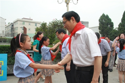图为在海滨二小,学生为王军一行系上红领巾。陈智慧摄