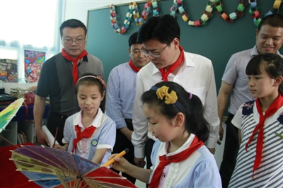 离开区五幼,王军一行又来到海滨二小。欢快的音乐声中,学生们为王军一行系上红领巾。王军参观了学校“学生园地”和午间趣味课堂,看到有学生正在试验机器人爬墙壁,王军对学生的创造力,对学校发扬学生特长的教育模式给予充分肯定。