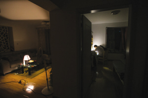 晚上10点,我摄影的同事等到了孙女士,她从学校接上儿子回到家,先用几个接线板把线路接到儿子的卧室,小台灯亮了起来。孙女士又回到自己卧室,点了一根蜡烛。