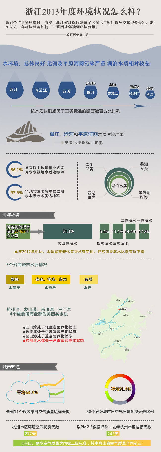 浙江省环保厅6月4日公布了2013年浙江省环境状况公报,总体上,浙江环境呈现稳中趋好的态势。