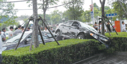 记者昨日下午在现场看到,从石阶处到被撞车子停放的地方差不多有十多米距离,绿化带上方的灌木丛叶子也都被车底“削平”了,“不知道的人还以为是人为修剪过的呢。”附近一位保洁员介绍。