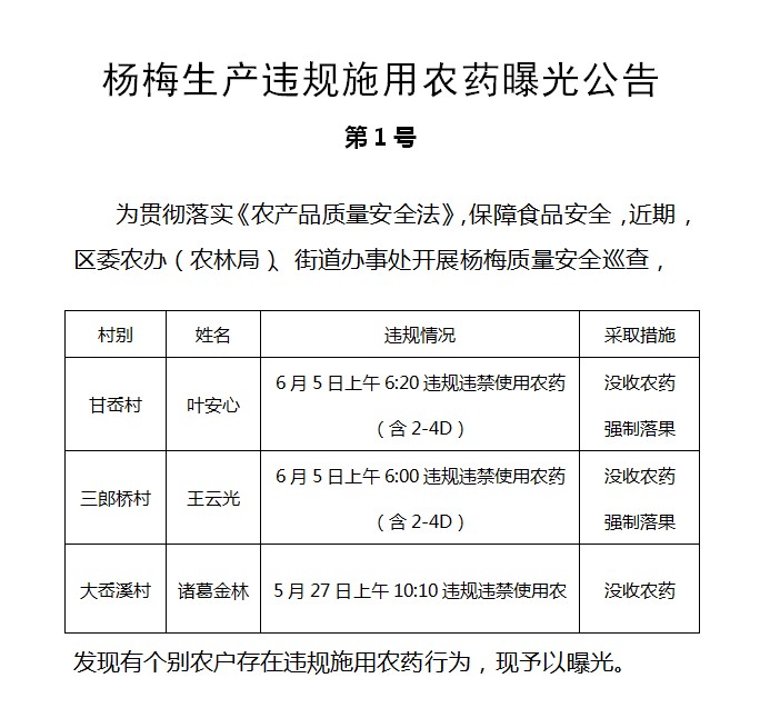 龙湾新闻网讯 为贯彻落实《农产品质量安全法》,保障食品安全,状元街道于6月5日上午例行巡查,将个别违规违禁施用农药的杨梅种植户进行强制落果、没收农药执法,并将曝光公告张贴于各村宣传栏、杨梅交易市场入口,以督促广大杨梅种植户认真落实杨梅生产与产品质量安全主体责任。(通讯员王潇)