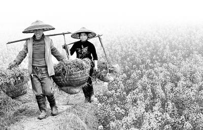湖南省邵阳县下花桥镇双联村两位妇女从油菜田里劳作归来。CFP