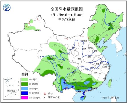 6月10日08时至11日08时,云南中东部、华南大部等地有中到大雨,其中,云南南部、广西南部、广东西南部、海南北部等地的部分地区有暴雨,局部大暴雨(100~130毫米);内蒙古中东部、华北东北部、山东东部、东北地区大部有阵雨或雷阵雨;上述局部地区并伴有短时雷雨大风等强对流天气。