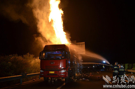 昨日凌晨3时47分许,一辆运送活鸡的河南籍半挂车在随岳高速公路随州往岳阳方向44公里处,发生自燃。湖北高速交警随县大队二中队民警接警后,以最快的速度赶到现场。