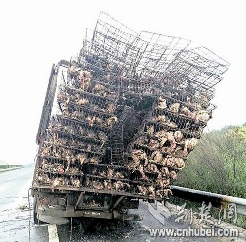昨日凌晨,湖北随岳高速公路随县境内,一辆满载活鸡的货车在行驶途中突然起火,高速交警和消防官兵迅速到场处置,货车受损不算太重。然而,车上9100多只鸡却没那么幸运,它们被困铁笼子里,仅有不到100只鸡逃出。高速交警配合随县农业和环保部门,将被烧死的9000只鸡,运往当地垃圾处理厂焚烧掩埋处理。这场意外,疑因轮胎过热导致摩擦起火引发,货主损失20多万元。