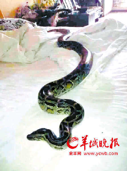 6月8日,记者联系上王海波,他回忆,6月2日晚上6时多,他给住在东莞珊美新庄的姑姑送去一只烧猪过节(当天是端午节),他姑姑王女士到二楼房间里拿东西时,忽然发现在自己的床上有一条黑色发亮的东西在动。姑姑小心掀开被子一看: “啊!大蛇啊!”