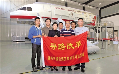 “寻路改革”采访组与吉祥航空培训基地工作人员合影。陈翔摄