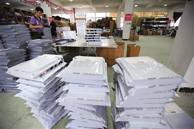 将寄出的服装装袋,是他们每天的工作。取出快递单、装袋、封口、贴上快递单,粗糙又有力的双手机械地重复着,他们脚边近一米宽的纸箱堆满了快递单背胶废弃料。“现在还算淡季,在这家企业平均一天要收两三千件,要是赶上促销活动,就有的忙了。”