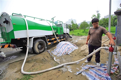 将河水作为城市路面冲洒水源,是中水处理应用的一种方式。在葡萄棚滨水公园附近的垃圾亭,一条埋在地下的水管延伸至附近的汇昌河内,水管另一头连接着一个18吨容量的储水罐。记者在现场看到,水泵作业时伸入河中的吸盘便将河水抽到储水罐中并过滤杂质。当洒水车需要灌水时,只需将水箱与出水阀门链接,通过两台水泵作业便可向车上水箱注水,注满一辆8吨的洒水车大约需要10分钟。