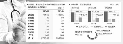 据统计,2011年至2013年,三明22家医院药品收入占比下降11.17%,医务性收入则从2011年的39%提高到2013年的近62%。
