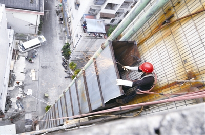 昨天上午10点左右,金信商厦烟囱前已搭起6层高的脚手架。负责拆除的施工队负责人夏师傅说,首先要将下面油垢较多的部分拆除,这样风割的火花不会引起火灾。记者在现场看到,烟囱的起点从商厦第二层开始,一直延伸至商厦顶层,有十层楼高,大约35米。“当时有规定,餐饮行业的油烟要高空排放,所以才会建这么高。”鹿城区城管与执法局五马中队执法人员金常谊介绍。“下面先打空,然后再从上面一片一片割下来。”夏师傅介绍,整个施工时间需要两天半。