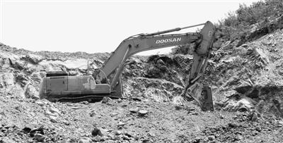 顺着对方手指的方向,另外一台橘红色套机正在作业,随着破碎锤强烈的震动,大块的硅矿石纷纷落下。在该作业面四周,到处是开挖的痕迹,原本的青山遍体鳞伤。