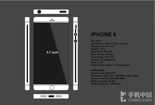 iPhone 6概念机配有一款5.7英寸的IPS LCD屏幕显示屏,拥有1200万像素后置摄像头与LED闪光灯和一个120万像素的前置镜头。采用苹果A9 64位双核1.8GHz处理器,2G内存,64G存储空间,电池方面则采用2400mAh。沿用了Touch ID指纹扫描功能。支持NFC、无线充电等功能。