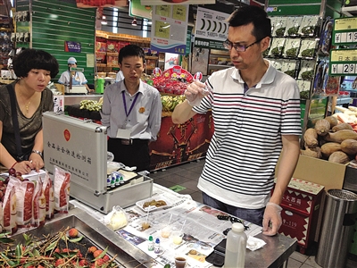 昨日,除了对现场制售食品和冷藏食品进行检查外,食品监测中心的工作人员还对超市里销售的虾皮、熟食、面包、海参、杨梅等进行检测,看看是否含有非法添加成分。