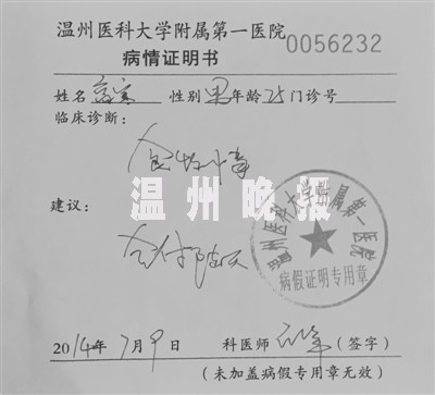 该门诊部的负责人一看这张病历,就笑了,“这也太山寨了,我们单位的医疗证明书是长方形的,而且是蓝色的表格。这个印章也不对,真的印章上写的是‘温州医科大学附属第一医院医疗专用章’。”