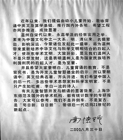 有关儿童智慧开发与朗诵的显著效果。上海华东师范及国外的学术机构,都有统计数字的专研报告,大家可以参考。我们不是开倒车,不是复古,是‘苟日新,日日新’,带领后一代迈向21世纪的新起点。”
