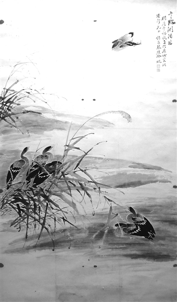 此外,还有两幅中堂字画,一为浙江龙泉画家徐焜的作品《寒临湘浦宿》,画了六只大雁,其中一只正在飞行归队,另五只夜宿在芦苇荡中,画笔老辣,构图清新,绝对是佳作一幅。一是瑞安书法家郑鼎彝所书的:“龟鹤年寿齐,羽介所讬殊。种种是灵物,相得忘形躯。鹤有冲霄心,龟厌曳尾居。”