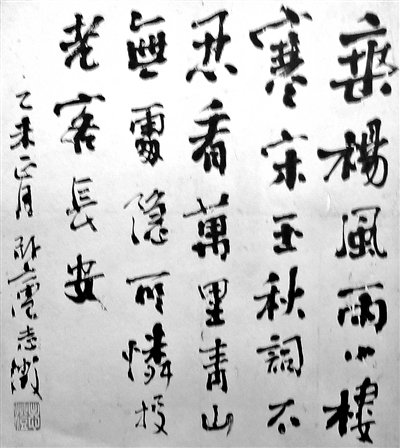号称“东南第一笔”的瑞安书法名家池志澂是瑞安现存墨宝数量最多的一位,他写的是七绝一首:“垂杨风雨小楼寒,宋玉秋词不忍看。万里青山无处隐,可怜投老客长安。”