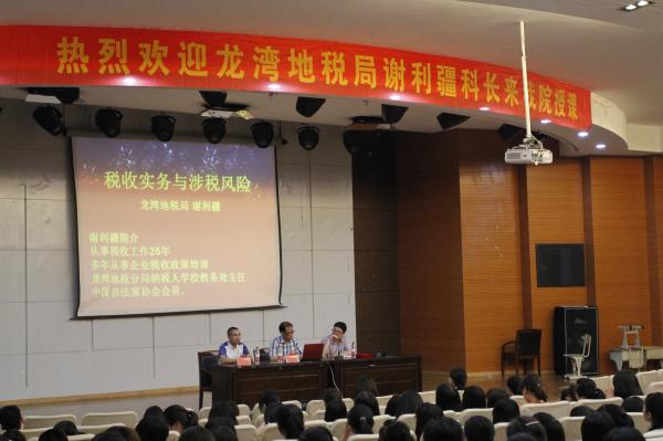 本期讲座主要内容为纳税实务与企业涉税风险方面的知识,从什么是企业涉税风险、常见的涉税风险类型等展开,穿插具体案例和对应政策的分析等。讲授内容来源于师生手中的课本和生活实际,又高于教材和实际,调动了在场师生的学习热情和探究欲望,起到答疑解惑和励志教育的作用,为这些未来的纳税人、会计和税务工作者做了一次精彩的培训。今后,分局税校合作项目将陆续进行,积极探索“税校合作税教共赢”新模式,实现资源共享,携手共进!