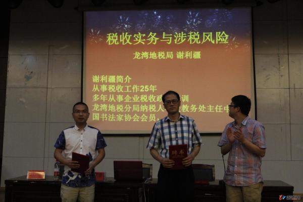 学校相关领导发表讲话,对龙湾地税分局表示了感谢,并送上聘书,正式聘请分局局长朱林光为校财贸系校外专家指导委员会委员,聘任分局综合业务一科副科长姜辉、综合业务二科科长谢利疆为财贸系兼职教师。