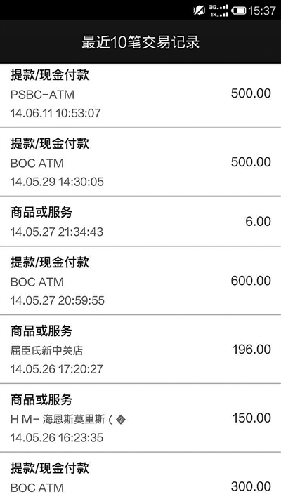“2014年6月11日10时53分07秒提款/现金付款500元”“2014年5月26日17时20分27秒商品或服务196元”……把银行卡放到手机背面轻轻一贴,不用输入银行卡密码,手机竟读出银行卡号和最近10次交易记录。