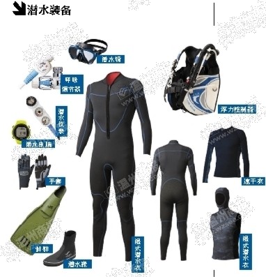 水肺潜水:背着压缩空气瓶(并非氧气瓶),利用水下呼吸器在水下呼吸,是真正潜入水底的一种潜水。全套水肺潜水装备包括面镜、呼吸管、脚蹼、呼吸器、潜水仪表、气瓶、浮力调整背心、潜水服等,潜水员在开放水域潜水时,有时还会携带潜水刀、水下手电乃至鱼枪等必要的辅助装备。