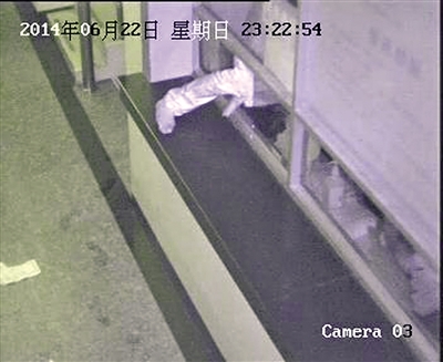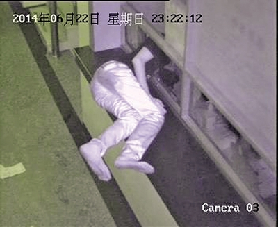 为了证实,院方调出正对收费窗口的监控,不看还好,一看把大家都惊呆了。事发前一天深夜11时多,值班医生休息之后,一个全副武装、头包毛巾的男子,用一条钢丝从外面抽开了收费窗口玻璃小窗的插销,然后从这个小窗口,像一条水蛇一样~“游”~了~进~去!(如图)要知道,这个小窗口,就是小孩也很难钻进去啊。