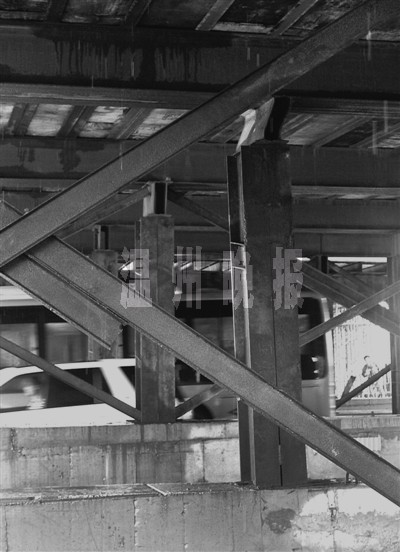 记者现场了解到,原来,是工人在拆除支架时,发现中间一条东向西车道上,有承重的钢柱发生了倾斜,几根顶着桥梁的工字钢发生了扭曲,变成了Z字形。工人见此急忙下了脚手架,并通知相关部门,采取紧急措施。