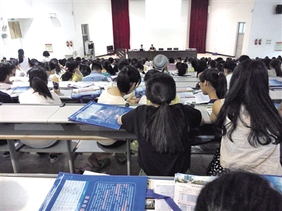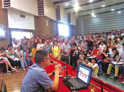 本报讯(爱冰) 6月23日,“2014高考志愿填报公益咨询会”走进泰顺中学。当天主讲的许进光老师是温州市名班主任、瓯海中学教育科研处主任,他主要为考生分析今年高考招生变化以及精准填报志愿的技巧。因为前来听讲座的人太多,很多人是站着听完整个讲座的,手机拍照、现场录音、快速笔记,大家为填报志愿而紧张“备课”。场面井然有序,考生家长们都认真地倾听专家说的每一句话。