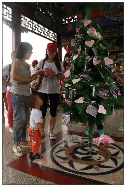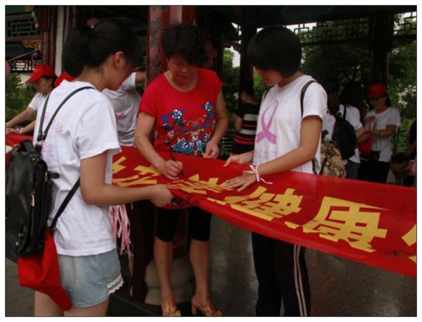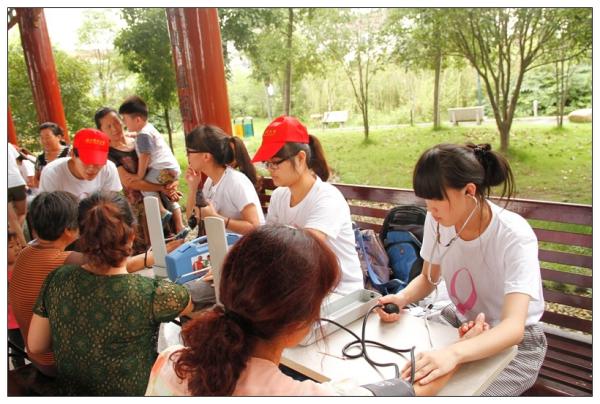 活动于当天下午三点准时启动。在生态公园的长廊上,队员们挂满了粉红色的气球与照片,那些照片记录了队员们在实践活动中的点点滴滴,喜笑欢欣,吸引了附近居住的叔叔阿姨驻足不前。长廊中间的亭子更是“人满为患”,左右边摆放了两张桌子,分别供测量血糖与血压的进行。“阿姨平时的血压怎么样呀?”实践队员孙梦娇一边专注的为阿姨测量血压,一边微笑着亲切询问阿姨日常的身体情况。左边血糖的测量也是进行的如火如荼,许多老年人不会说普通话,温州的实践队成员便成了现成的“小翻译”,用家乡话给老人们带去最质朴温馨的安慰与关怀。一旁设有专门的乳腺健康知识的讲解,小老师们一边对着kt版讲解,一边手把手教她们如何自检。亭子的中间是一颗装饰了粉红色祝福卡和照片的心愿树,祝福卡是实践队成员们在来往医院与社区的过程中所收集的,每一张都包含了一份最诚挚的祝福,来自社会关爱的力量,希望所有的患者都能够早日恢复健康。