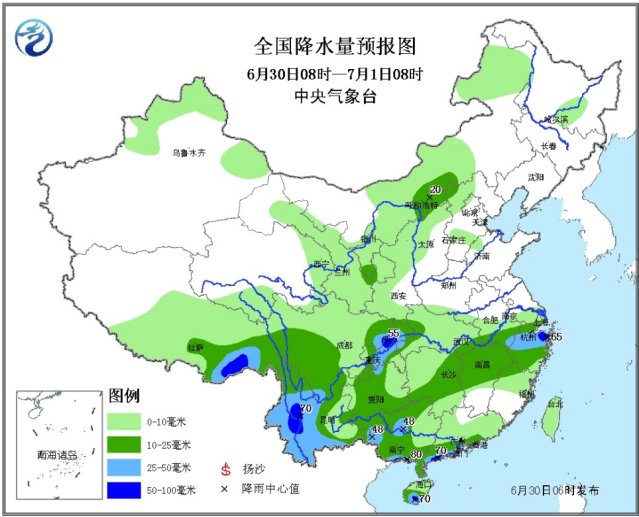 6月30日08时至7月1日08时,西藏东南部、四川西南部和东北部、重庆、云南、华南南部和西部、江南北部等地有中到大雨,其中,云南西部、广东西南部、广西南部、海南南部、浙江东北部等地的局部地区有暴雨(50~80毫米);上述局地并伴有短时强降水和雷雨大风等强对流天气。