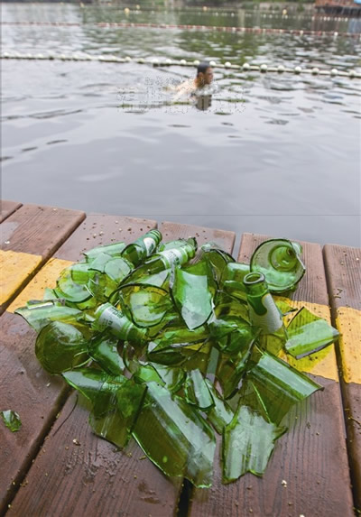 据介绍,该水域湖底铺有凹凸不平的石块,尖锐的玻璃碎片容易卡在石块缝隙里,对游泳的人造成伤害,也不容易被清理。我们想说,九山湖是给市民提供免费游泳的公共场所,湖区环境需要大家共同维护,不要随意将垃圾扔入河中。