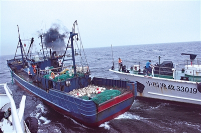 当渔政艇喊话,责令他们停船接受检查时,这些渔船竟然抗拒检查,甚至调转船头碰撞渔政船。这些渔轮为躲避渔政船靠帮检查,在船的两舷插着1米多长的钢筋。无奈之下,渔政艇采取两船夹击,强行靠帮的方法,经过几个会合的较量,才制服了这些违规渔船,并查扣了三艘。