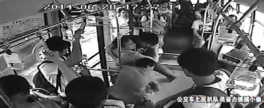 上车后,3名反扒队员径直走向坐在靠近下客门的罗某,问清楚身份后,靳东鹏先将罗某控制,随即冲向坐在车厢最后排的黎某,与此同时,叶钊开始动手控制坐在罗某后排的唐某。